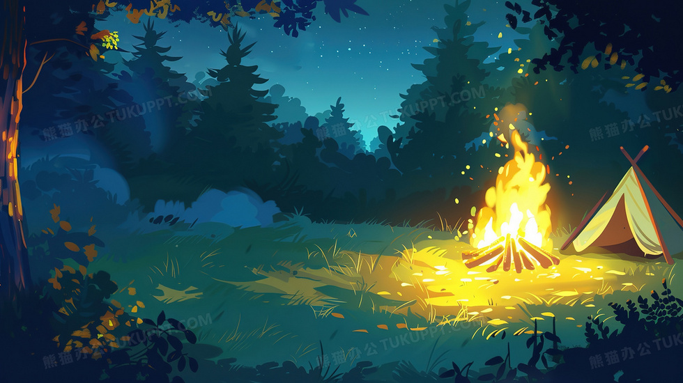 本作品内容为晚上森林里的篝火插画, 格式为 jpg, 大小2 MB, 图片尺寸为2912 x 1632, 源文件无水印, 欢迎使用熊猫办公。 如认为平台内容涉嫌侵权,可通过邮件:tousu@tukuppt.com提出书面通知,我们将及时处理。