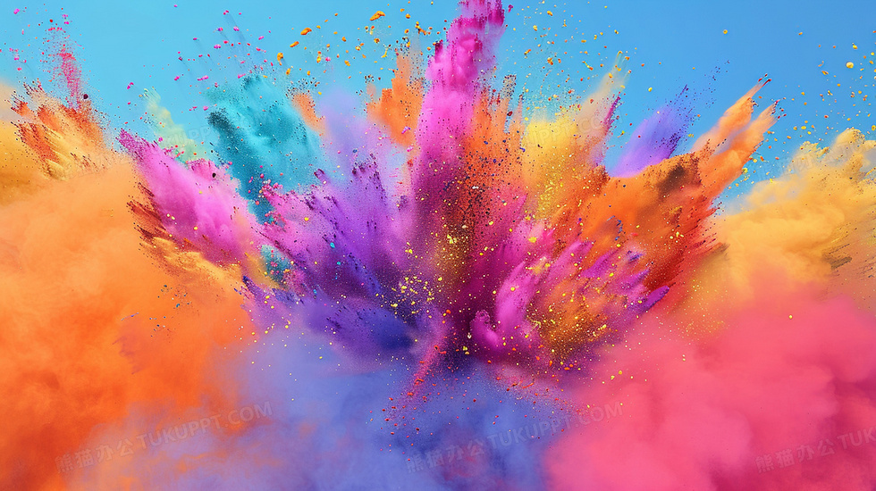 本作品内容为彩色飞溅粉末质感背景, 格式为 jpg, 大小4 MB, 图片尺寸为2912 x 1632, 作品中背景图片无需修改, 源文件无水印,可以直接使用, 欢迎使用熊猫办公。 如认为平台内容涉嫌侵权,可通过邮件:tousu@tukuppt.com提出书面通知,我们将及时处理。