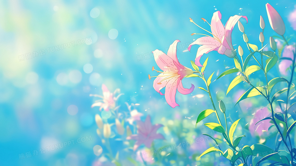 本作品内容为唯美清新百合花粉色花插画, 格式为 jpg, 大小3 MB, 图片尺寸为2880 x 1620, 源文件无水印, 欢迎使用熊猫办公。 如认为平台内容涉嫌侵权,可通过邮件:tousu@tukuppt.com提出书面通知,我们将及时处理。
