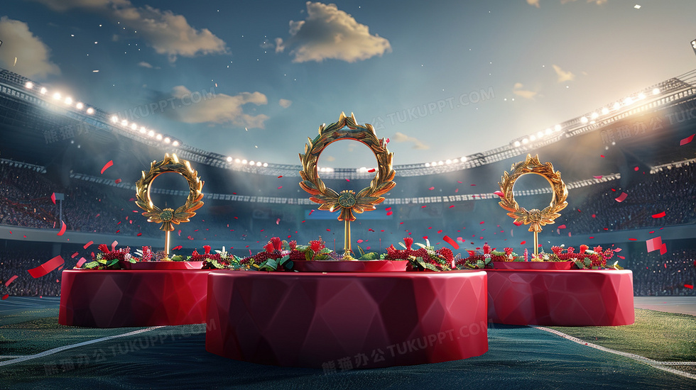本作品内容为运动会舞台上的奖杯插画, 格式为 jpg, 大小3 MB, 图片尺寸为2912 x 1632, 源文件无水印, 欢迎使用熊猫办公。 如认为平台内容涉嫌侵权,可通过邮件:tousu@tukuppt.com提出书面通知,我们将及时处理。