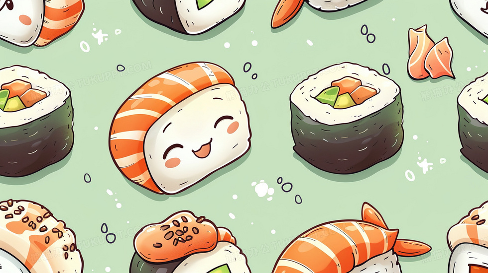 本作品内容为卡通可爱寿司美食背景, 格式为 jpg, 大小5 MB, 图片尺寸为2912 x 1632, 作品中背景图片无需修改, 源文件无水印,可以直接使用, 欢迎使用熊猫办公。 如认为平台内容涉嫌侵权,可通过邮件:tousu@tukuppt.com提出书面通知,我们将及时处理。