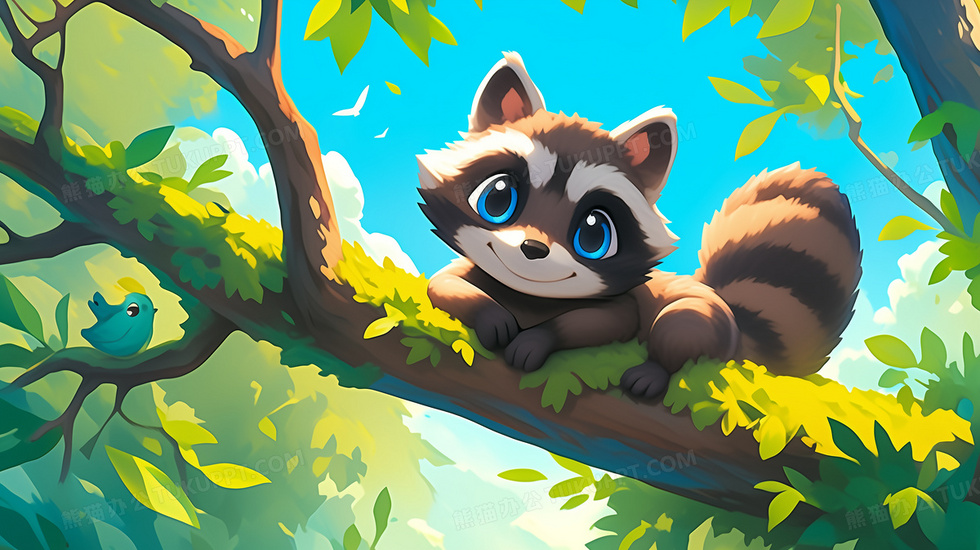 本作品内容为一只可爱的拟人化小浣熊趴在树上微笑插画, 格式为 jpg, 大小5 MB, 图片尺寸为2912 x 1632, 源文件无水印, 欢迎使用熊猫办公。 如认为平台内容涉嫌侵权,可通过邮件:tousu@tukuppt.com提出书面通知,我们将及时处理。