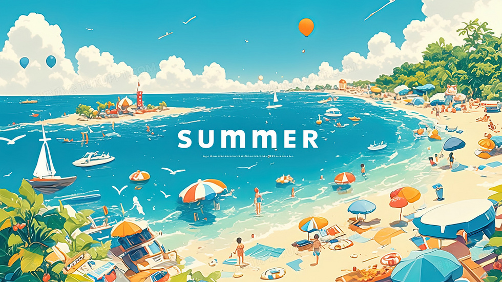 本作品内容为蓝天白云夏日海边沙滩插画, 格式为 jpg, 大小3 MB, 图片尺寸为2912 x 1632, 源文件无水印, 欢迎使用熊猫办公。 如认为平台内容涉嫌侵权,可通过邮件:tousu@tukuppt.com提出书面通知,我们将及时处理。