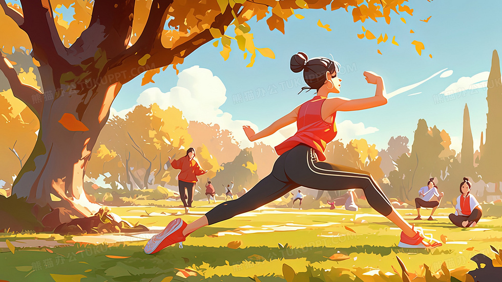 本作品内容为秋季养生公园练习中国功夫的少女插画, 格式为 jpg, 大小3 MB, 图片尺寸为2912 x 1632, 源文件无水印, 欢迎使用熊猫办公。 如认为平台内容涉嫌侵权,可通过邮件:tousu@tukuppt.com提出书面通知,我们将及时处理。