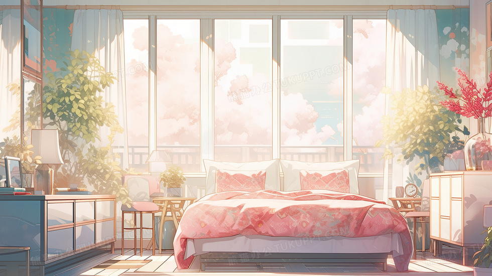 本作品内容为卡通唯美家居卧室床生活场景插画, 格式为 jpg, 大小3 MB, 图片尺寸为2912 x 1632, 源文件无水印, 欢迎使用熊猫办公。 如认为平台内容涉嫌侵权,可通过邮件:tousu@tukuppt.com提出书面通知,我们将及时处理。