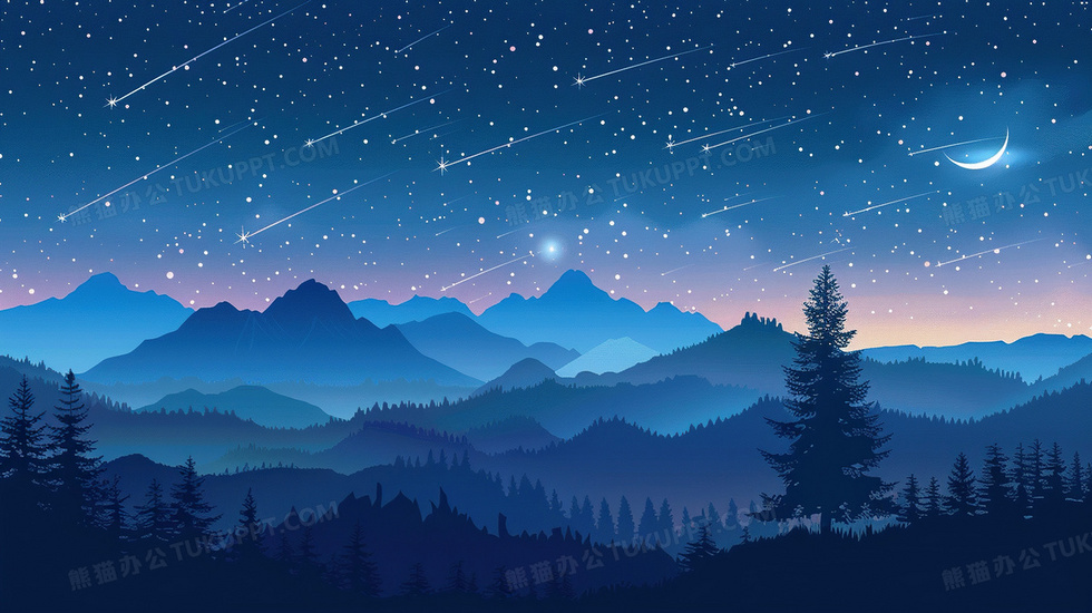 本作品内容为梦幻森林星空风景背景, 格式为 jpg, 大小4 MB, 图片尺寸为2912 x 1632, 作品中背景图片无需修改, 源文件无水印,可以直接使用, 欢迎使用熊猫办公。 如认为平台内容涉嫌侵权,可通过邮件:tousu@tukuppt.com提出书面通知,我们将及时处理。