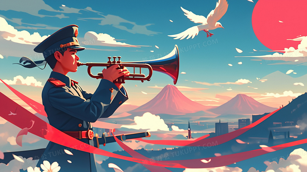 本作品内容为国庆节军人吹响军号庆祝插画, 格式为 jpg, 大小3 MB, 图片尺寸为2912 x 1632, 源文件无水印, 欢迎使用熊猫办公。 如认为平台内容涉嫌侵权,可通过邮件:tousu@tukuppt.com提出书面通知,我们将及时处理。