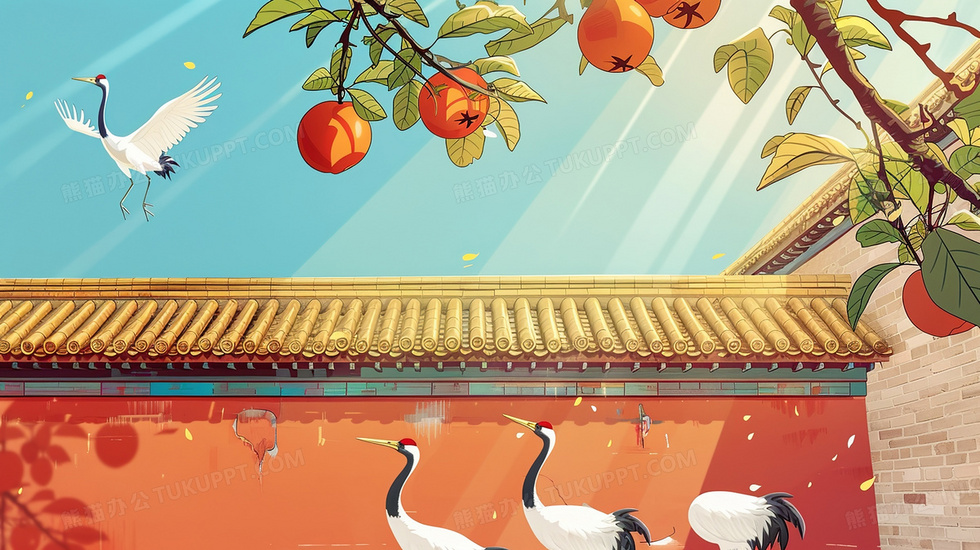 本作品内容为秋季宫墙上的仙鹤和柿子插画, 格式为 jpg, 大小3 MB, 图片尺寸为2912 x 1632, 源文件无水印, 欢迎使用熊猫办公。 如认为平台内容涉嫌侵权,可通过邮件:tousu@tukuppt.com提出书面通知,我们将及时处理。