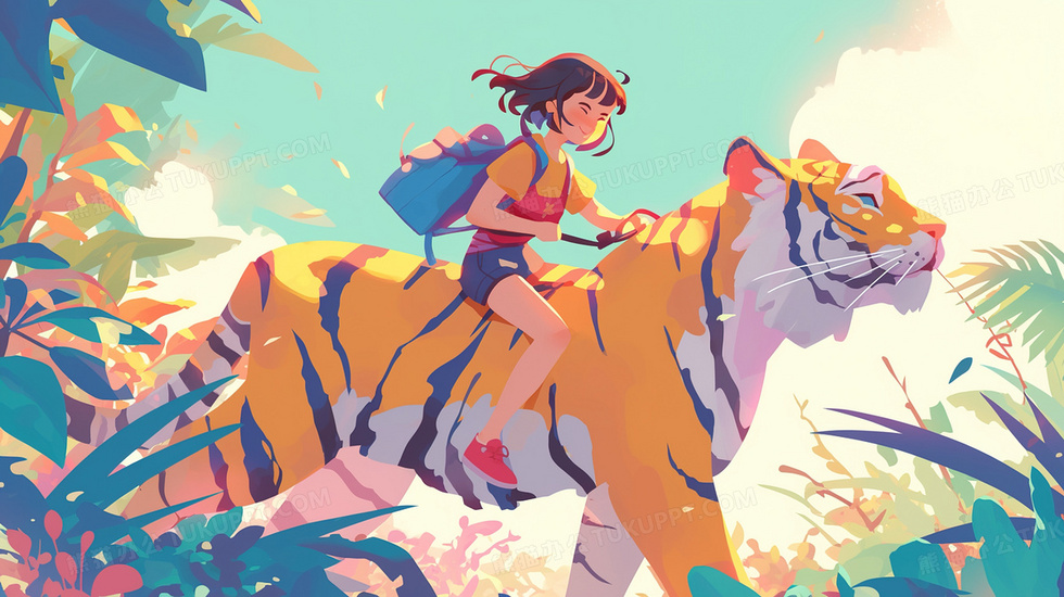 本作品内容为秋天秋老虎骑老虎的女孩创意插画, 格式为 jpg, 大小2 MB, 图片尺寸为2912 x 1632, 源文件无水印, 欢迎使用熊猫办公。 如认为平台内容涉嫌侵权,可通过邮件:tousu@tukuppt.com提出书面通知,我们将及时处理。