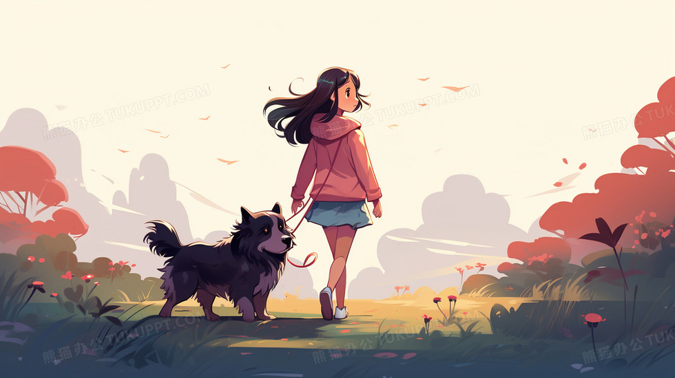 本作品内容为遛狗的小女孩卡通插画, 格式为 jpg, 大小4 MB, 图片尺寸为2912 x 1632, 源文件无水印, 欢迎使用熊猫办公。 如认为平台内容涉嫌侵权,可通过邮件:tousu@tukuppt.com提出书面通知,我们将及时处理。