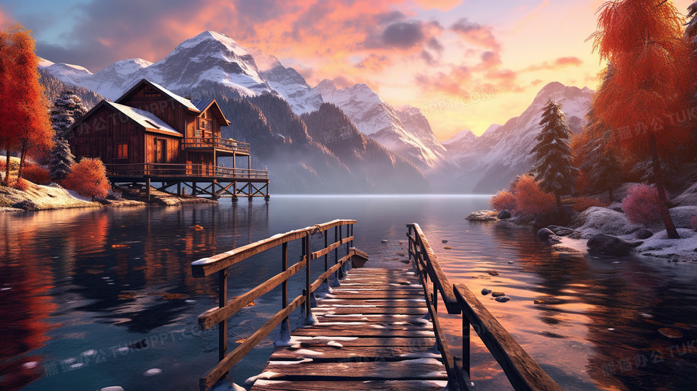 本作品内容为冬天雪山下山谷湖边的小木屋创意插画, 格式为 jpg, 大小7 MB, 图片尺寸为2912 x 1632, 源文件无水印, 欢迎使用熊猫办公。 如认为平台内容涉嫌侵权,可通过邮件:tousu@tukuppt.com提出书面通知,我们将及时处理。