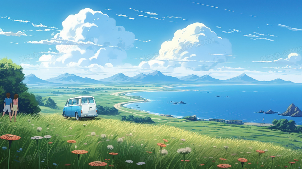 本作品内容为春天蓝天下海边草地上的小型巴士插画, 格式为 jpg, 大小5 MB, 图片尺寸为2912 x 1632, 源文件无水印, 欢迎使用熊猫办公。 如认为平台内容涉嫌侵权,可通过邮件:tousu@tukuppt.com提出书面通知,我们将及时处理。