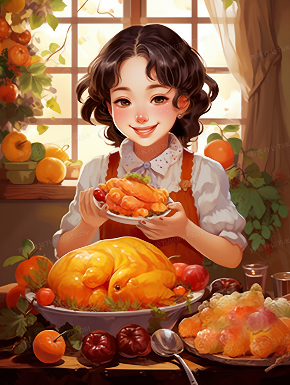 本作品内容为感恩节女孩烤鸡美食插画, 格式为 jpg, 大小5 MB, 图片尺寸为1760 x 2336, 源文件无水印, 欢迎使用熊猫办公。 如认为平台内容涉嫌侵权,可通过邮件:tousu@tukuppt.com提出书面通知,我们将及时处理。