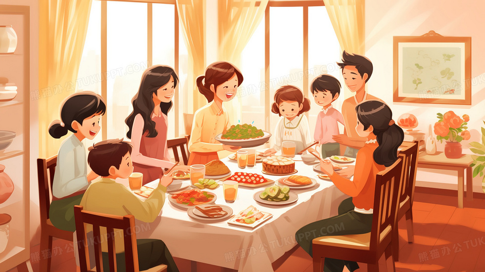 本作品内容为感恩节家庭聚餐美食插画, 格式为 jpg, 大小4 MB, 图片尺寸为2912 x 1632, 源文件无水印, 欢迎使用熊猫办公。 如认为平台内容涉嫌侵权,可通过邮件:tousu@tukuppt.com提出书面通知,我们将及时处理。