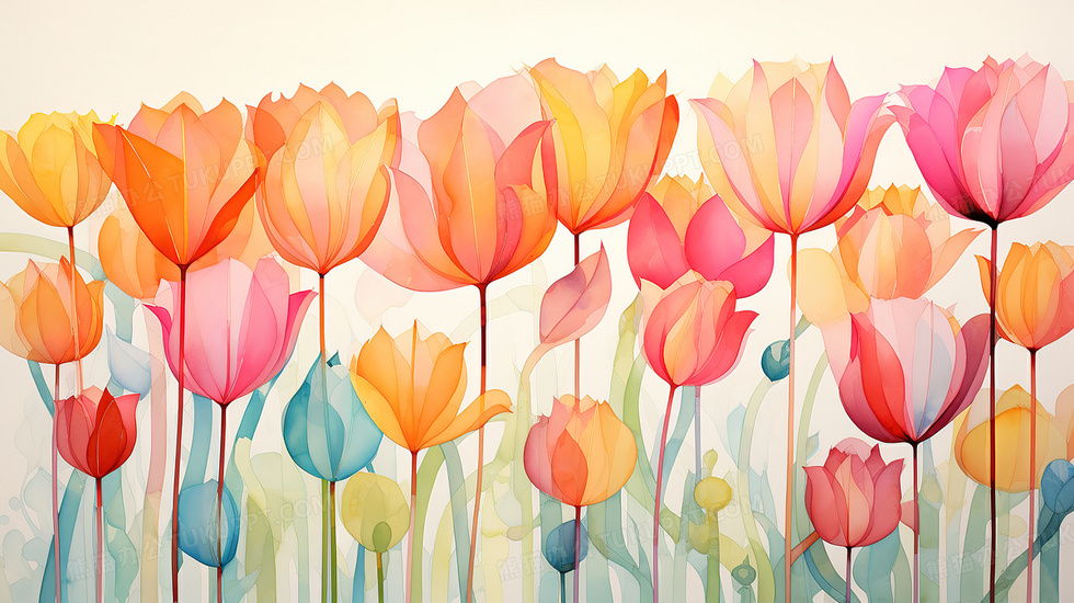 本作品内容为彩色花卉植物郁金香手绘插画, 格式为 jpg, 大小6 MB, 图片尺寸为2912 x 1632, 源文件无水印, 欢迎使用熊猫办公。 如认为平台内容涉嫌侵权,可通过邮件:tousu@tukuppt.com提出书面通知,我们将及时处理。