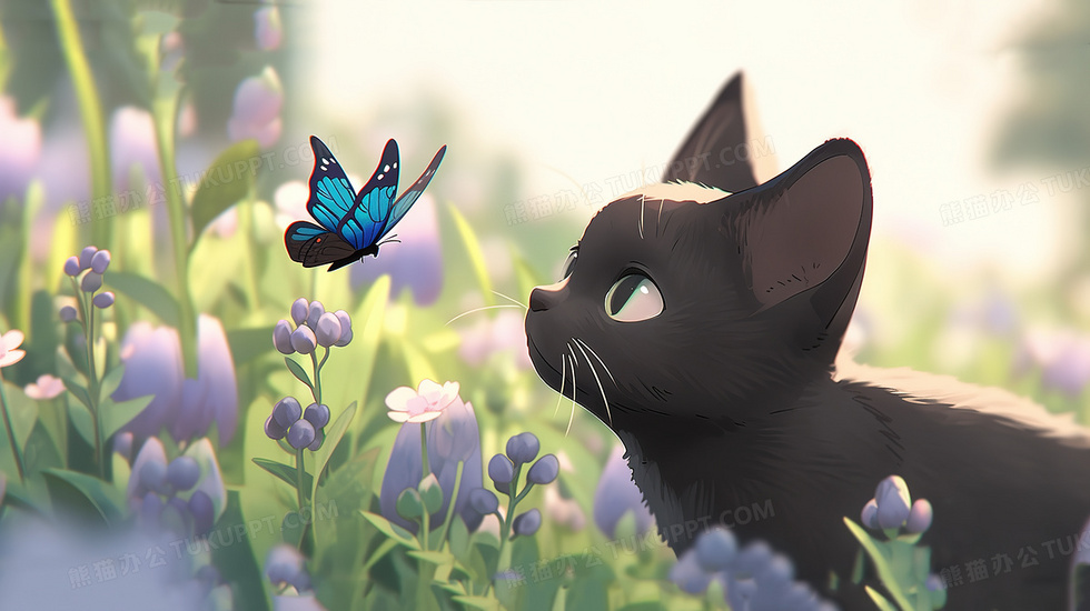 本作品内容为可爱的小猫在花丛中被蝴蝶吸引创意插画, 格式为 jpg, 大小5 MB, 图片尺寸为2912 x 1632, 源文件无水印, 欢迎使用熊猫办公。 如认为平台内容涉嫌侵权,可通过邮件:tousu@tukuppt.com提出书面通知,我们将及时处理。