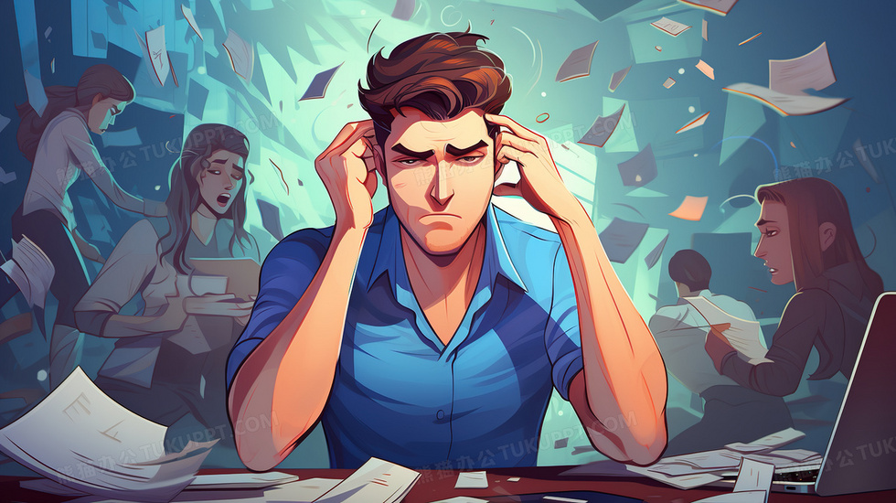本作品内容为压力山大的职场人士插画, 格式为 jpg, 大小5 MB, 图片尺寸为2912 x 1632, 源文件无水印, 欢迎使用熊猫办公。 如认为平台内容涉嫌侵权,可通过邮件:tousu@tukuppt.com提出书面通知,我们将及时处理。
