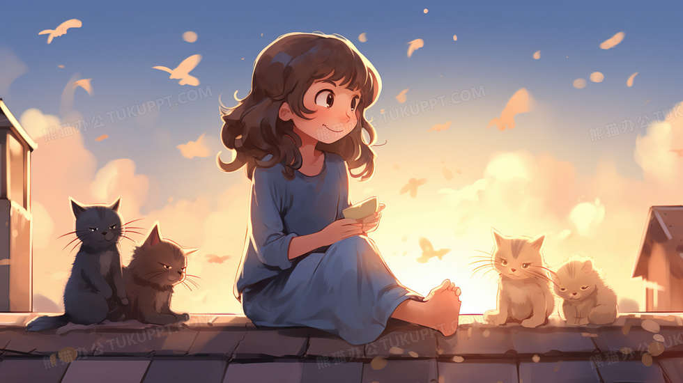 本作品内容为屋顶上的女孩和猫咪卡通插画, 格式为 jpg, 大小4 MB, 图片尺寸为2912 x 1632, 源文件无水印, 欢迎使用熊猫办公。 如认为平台内容涉嫌侵权,可通过邮件:tousu@tukuppt.com提出书面通知,我们将及时处理。