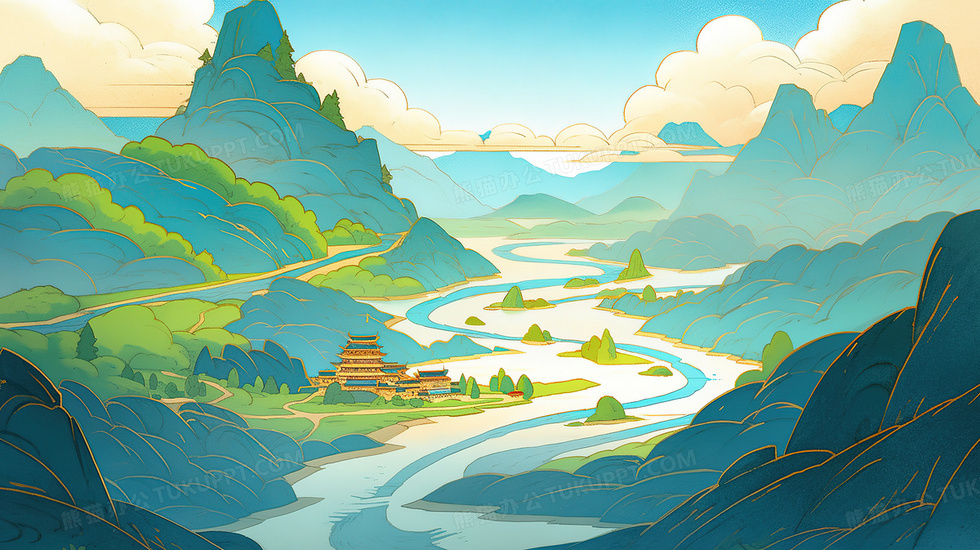 本作品内容为创意国潮中国风山水风景画, 格式为 jpg, 大小7 MB, 图片尺寸为2912 x 1632, 源文件无水印, 欢迎使用熊猫办公。 如认为平台内容涉嫌侵权,可通过邮件:tousu@tukuppt.com提出书面通知,我们将及时处理。