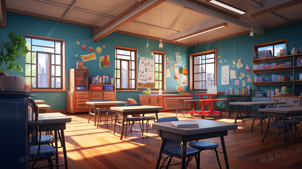 本作品内容为阳光照射下的教室插画, 格式为 jpg, 大小6 MB, 图片尺寸为2912 x 1632, 源文件无水印, 欢迎使用熊猫办公。 如认为平台内容涉嫌侵权,可通过邮件:tousu@tukuppt.com提出书面通知,我们将及时处理。