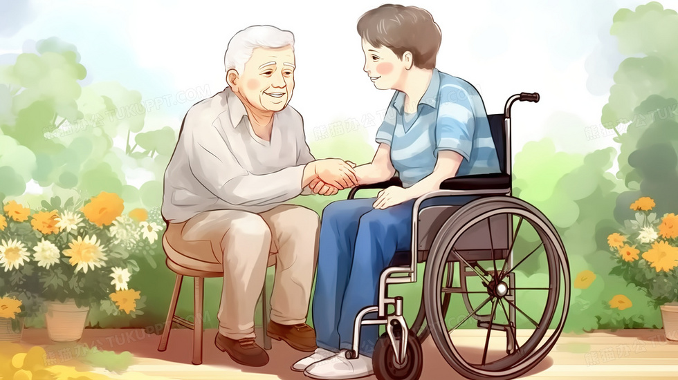 本作品内容为老人陪伴坐轮椅的年轻人温馨插画, 格式为 jpg, 大小5 MB, 图片尺寸为2912 x 1632, 源文件无水印, 欢迎使用熊猫办公。 如认为平台内容涉嫌侵权,可通过邮件:tousu@tukuppt.com提出书面通知,我们将及时处理。