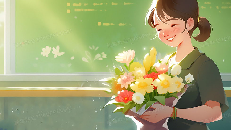 本作品内容为美丽的女老师抱着鲜花在黑板前开心的笑教师节创意插画, 格式为 jpg, 大小4 MB, 图片尺寸为2516 x 1416, 源文件无水印, 欢迎使用熊猫办公。 如认为平台内容涉嫌侵权,可通过邮件:tousu@tukuppt.com提出书面通知,我们将及时处理。