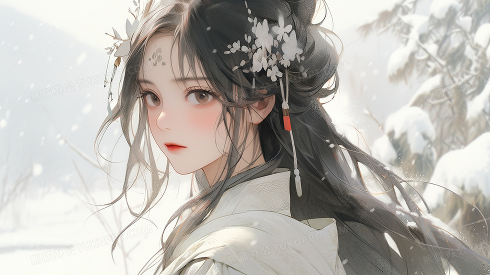 本作品内容为唯美古风冬日雪景中的少女创意插画, 格式为 jpg, 大小7 MB, 图片尺寸为2912 x 1632, 源文件无水印, 欢迎使用熊猫办公。 如认为平台内容涉嫌侵权,可通过邮件:tousu@tukuppt.com提出书面通知,我们将及时处理。