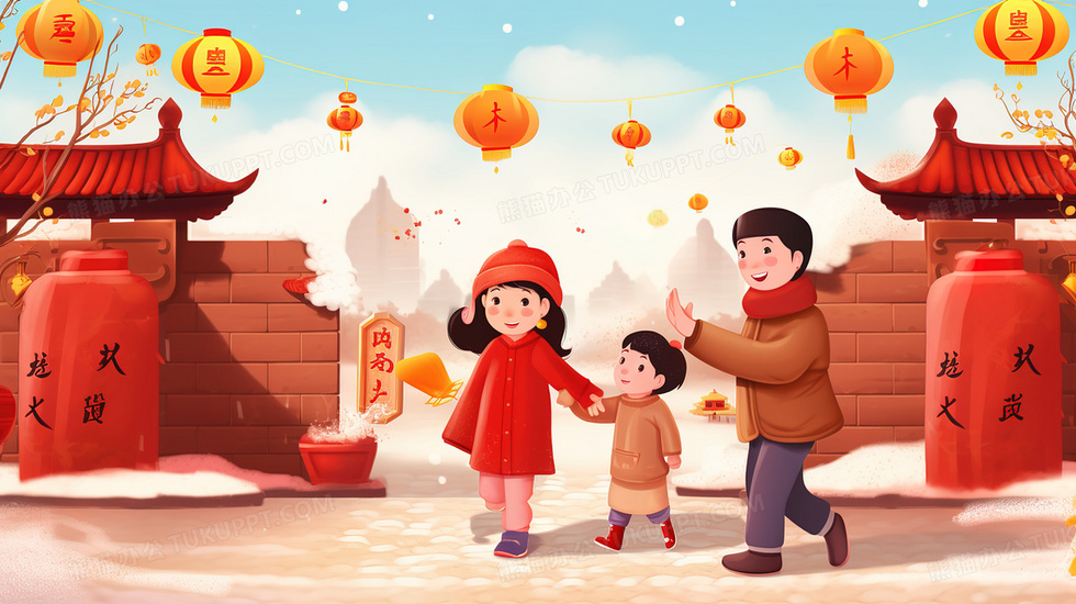 本作品内容为过年家长带着小孩去赶集红色卡通插画, 格式为 jpg, 大小5 MB, 图片尺寸为2912 x 1632, 源文件无水印, 欢迎使用熊猫办公。 如认为平台内容涉嫌侵权,可通过邮件:tousu@tukuppt.com提出书面通知,我们将及时处理。