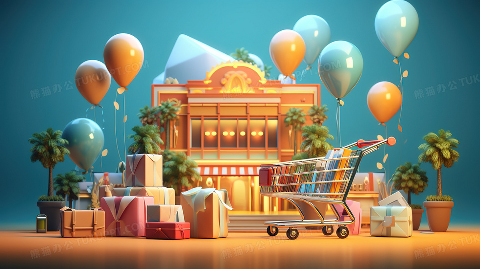 本作品内容为商店促销活动商品和购物车立体模型插画, 格式为 jpg, 大小6 MB, 图片尺寸为2912 x 1632, 源文件无水印, 欢迎使用熊猫办公。 如认为平台内容涉嫌侵权,可通过邮件:tousu@tukuppt.com提出书面通知,我们将及时处理。