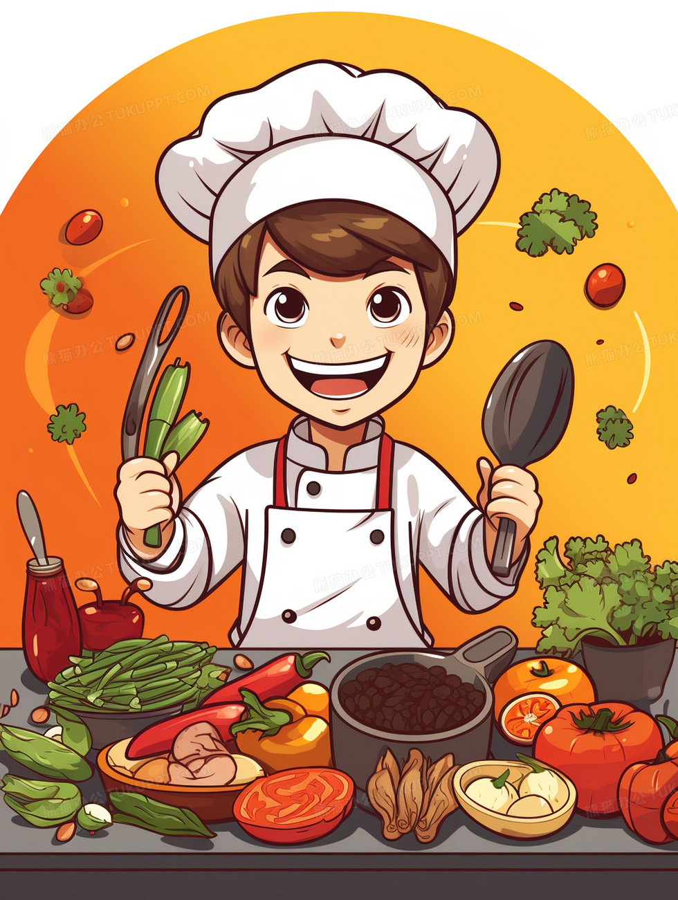 本作品内容为丰富的食材和烹饪的厨师卡通插画, 格式为 jpg, 大小5 MB, 图片尺寸为1856 x 2464, 源文件无水印, 欢迎使用熊猫办公。 如认为平台内容涉嫌侵权,可通过邮件:tousu@tukuppt.com提出书面通知,我们将及时处理。