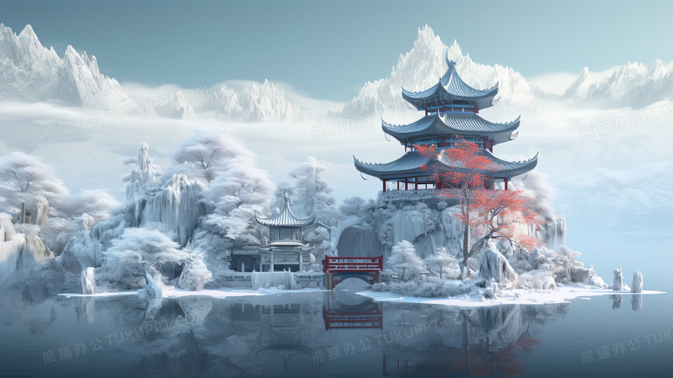 本作品内容为中国风湖畔雪山上的古典建筑山水风景插画, 格式为 jpg, 大小6 MB, 图片尺寸为2912 x 1632, 源文件无水印, 欢迎使用熊猫办公。 如认为平台内容涉嫌侵权,可通过邮件:tousu@tukuppt.com提出书面通知,我们将及时处理。