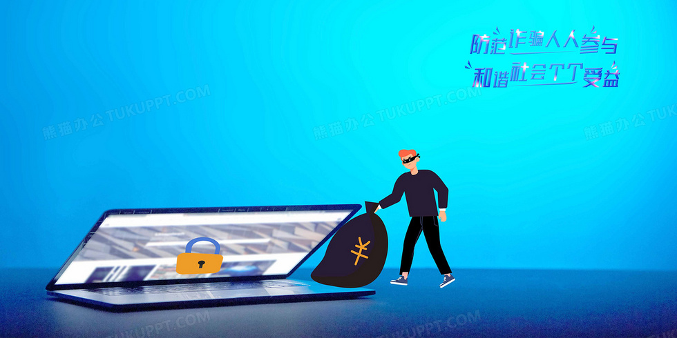 本作品内容为防诈骗防止网络诈骗摄影合成背景, 格式为 psd, 大小15 MB, 图片尺寸为4724 x 2362, 作品中背景图片无需修改, 源文件无水印,可以直接使用, 欢迎使用熊猫办公。 如认为平台内容涉嫌侵权,可通过邮件:tousu@tukuppt.com提出书面通知,我们将及时处理。
