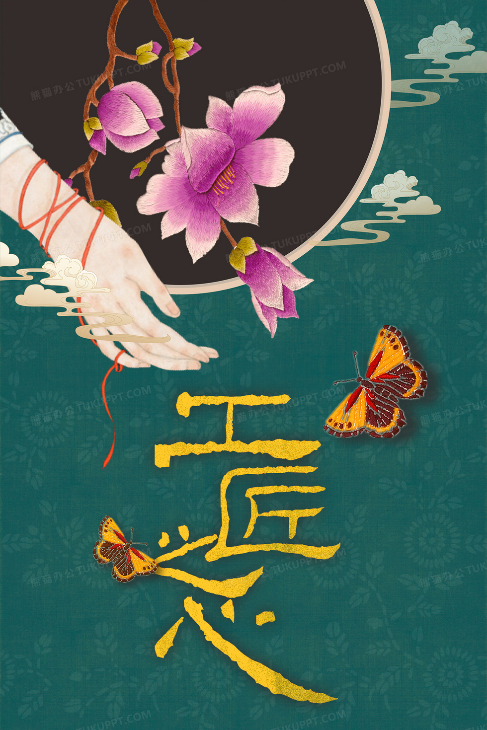 本作品内容为绿色中国风工匠之心刺绣背景, 格式为 psd, 大小112 MB, 图片尺寸为3543 x 5315, 作品中背景图片无需修改, 源文件无水印,可以直接使用, 欢迎使用熊猫办公。 如认为平台内容涉嫌侵权,可通过邮件:tousu@tukuppt.com提出书面通知,我们将及时处理。
