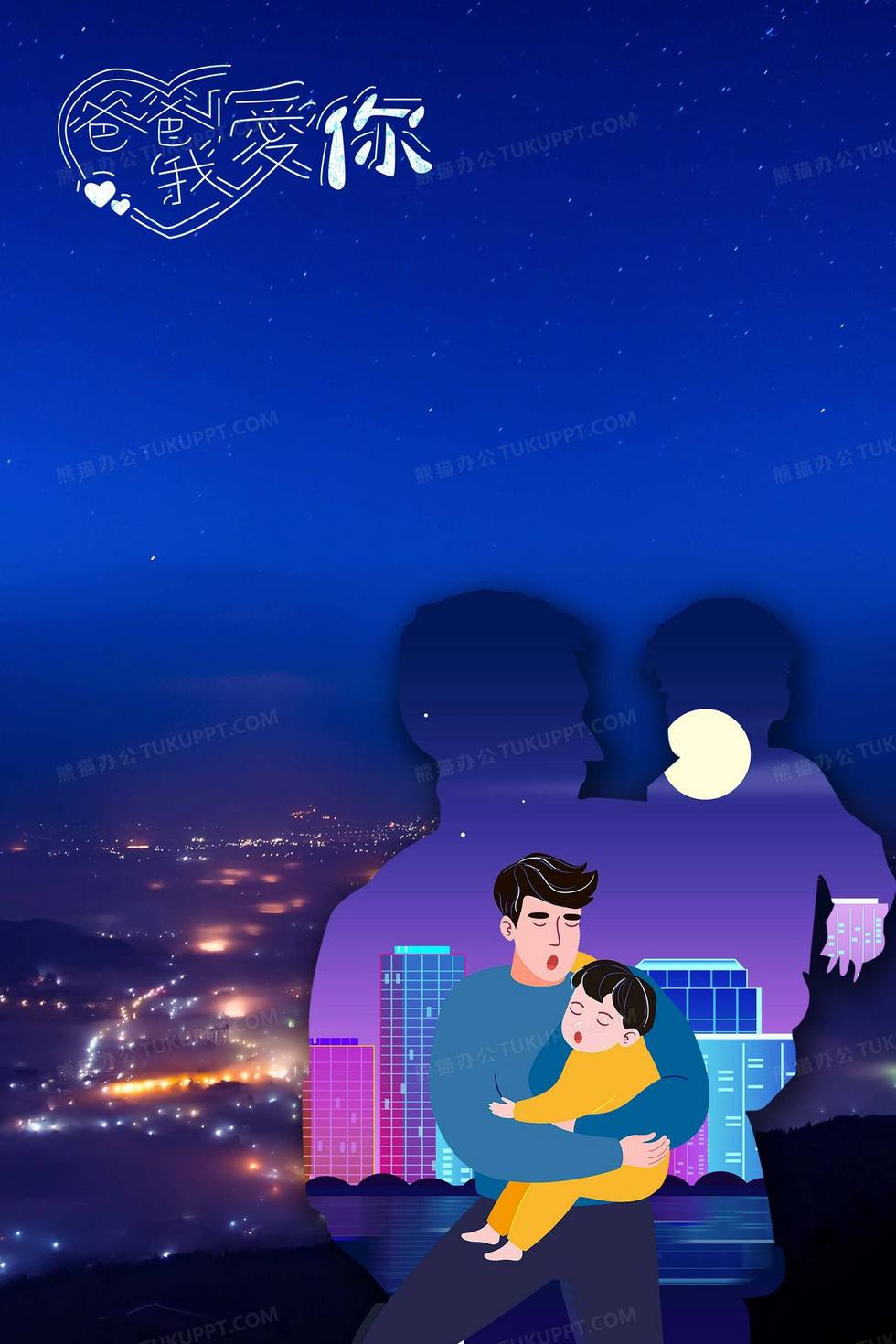 本作品内容为城市夜景摄影父亲节合成背景, 格式为 psd, 大小32 MB, 图片尺寸为2362 x 3543, 作品中背景图片无需修改, 源文件无水印,可以直接使用, 欢迎使用熊猫办公。 如认为平台内容涉嫌侵权,可通过邮件:tousu@tukuppt.com提出书面通知,我们将及时处理。