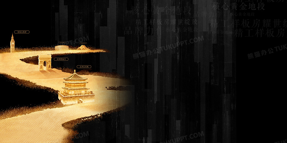 本作品内容为创意简约房地产黑金背景, 格式为 psd, 大小75 MB, 图片尺寸为7087 x 3543, 作品中背景图片无需修改, 源文件无水印,可以直接使用, 欢迎使用熊猫办公。 如认为平台内容涉嫌侵权,可通过邮件:tousu@tukuppt.com提出书面通知,我们将及时处理。