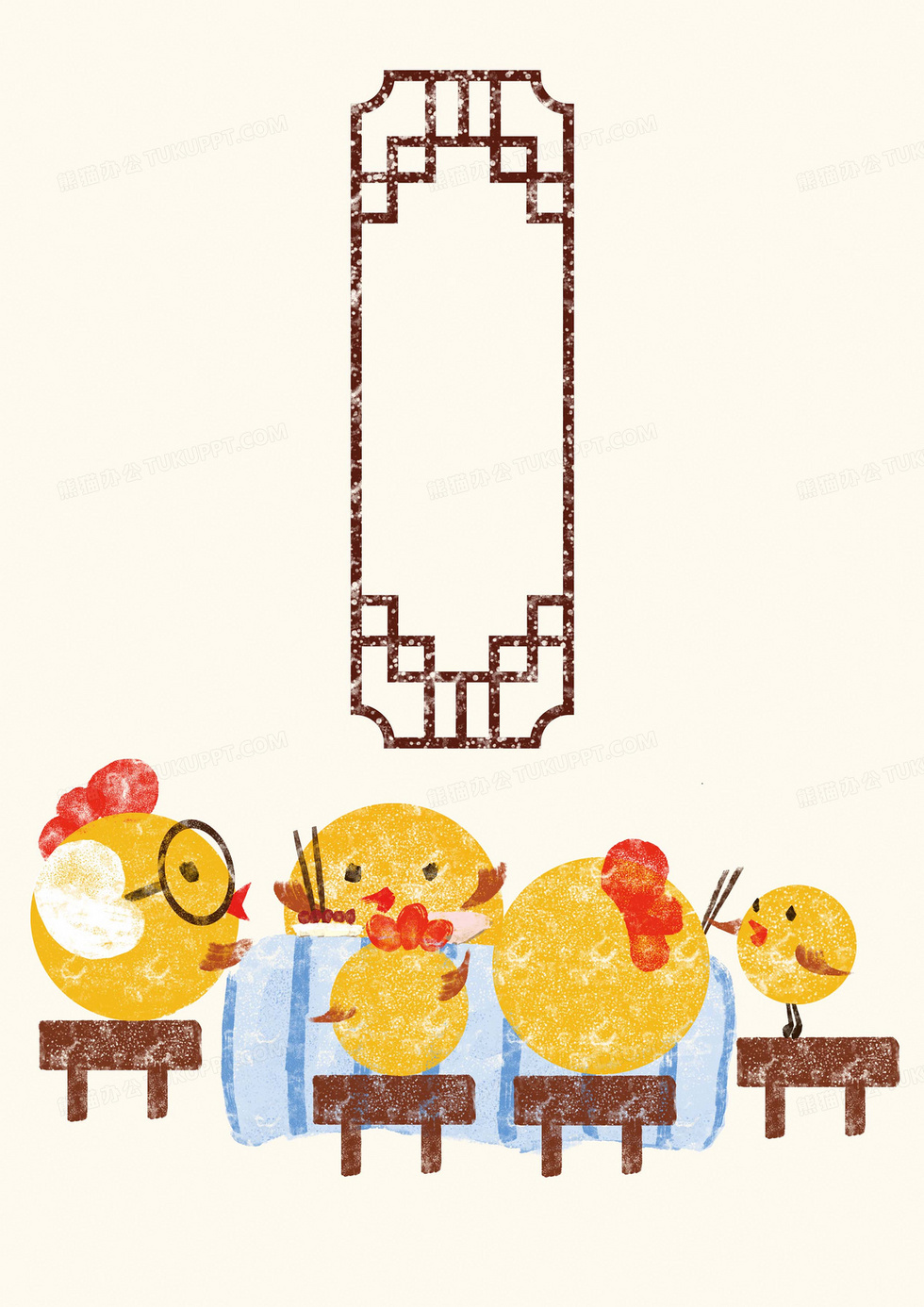 本作品内容为鸡年年夜饭手绘插画海报背景模板, 格式为 psd, 图片尺寸为2480 x 3508, 作品中背景图片无需修改, 源文件无水印,可以直接使用, 欢迎使用熊猫办公。 如认为平台内容涉嫌侵权,可通过邮件:tousu@tukuppt.com提出书面通知,我们将及时处理。