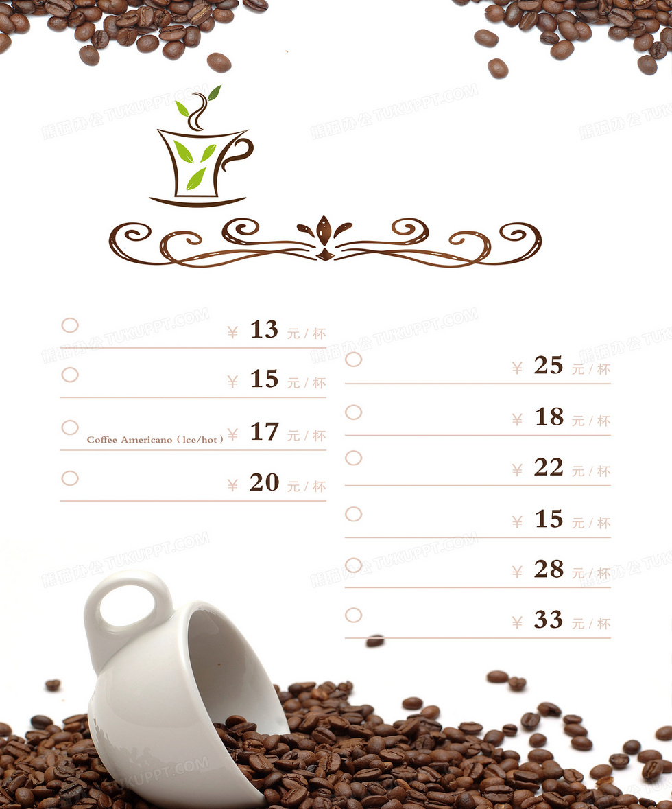 本作品内容为咖啡店简约菜单, 格式为 psd, 图片尺寸为3500 x 4211, 作品中背景图片无需修改, 源文件无水印,可以直接使用, 欢迎使用熊猫办公。 如认为平台内容涉嫌侵权,可通过邮件:tousu@tukuppt.com提出书面通知,我们将及时处理。