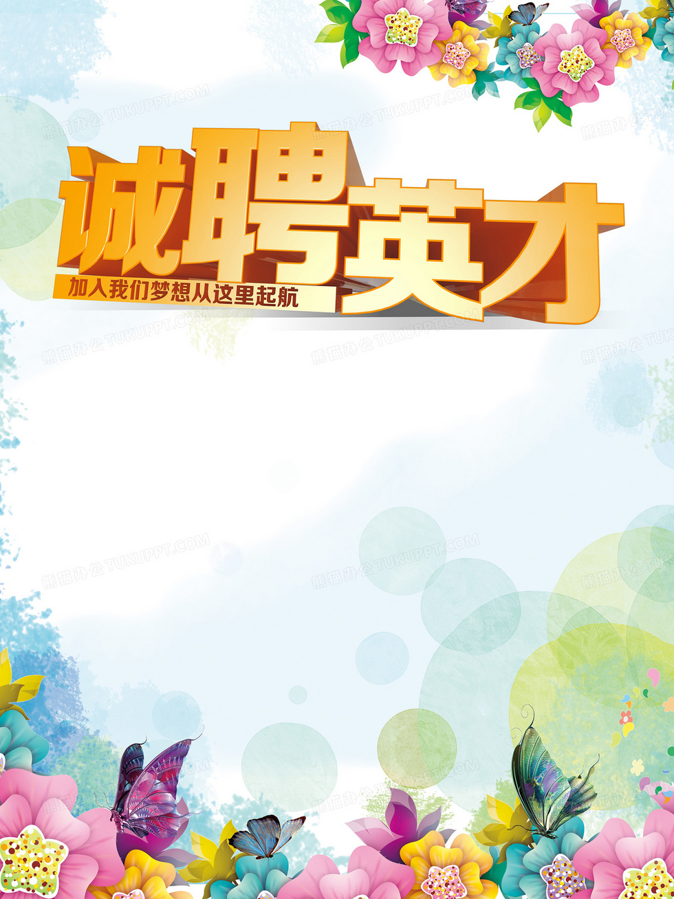 本作品内容为唯美花卉背景诚聘英才背景素材, 格式为 psd, 图片尺寸为3543 x 4724, 作品中背景图片无需修改, 源文件无水印,可以直接使用, 欢迎使用熊猫办公。 如认为平台内容涉嫌侵权,可通过邮件:tousu@tukuppt.com提出书面通知,我们将及时处理。