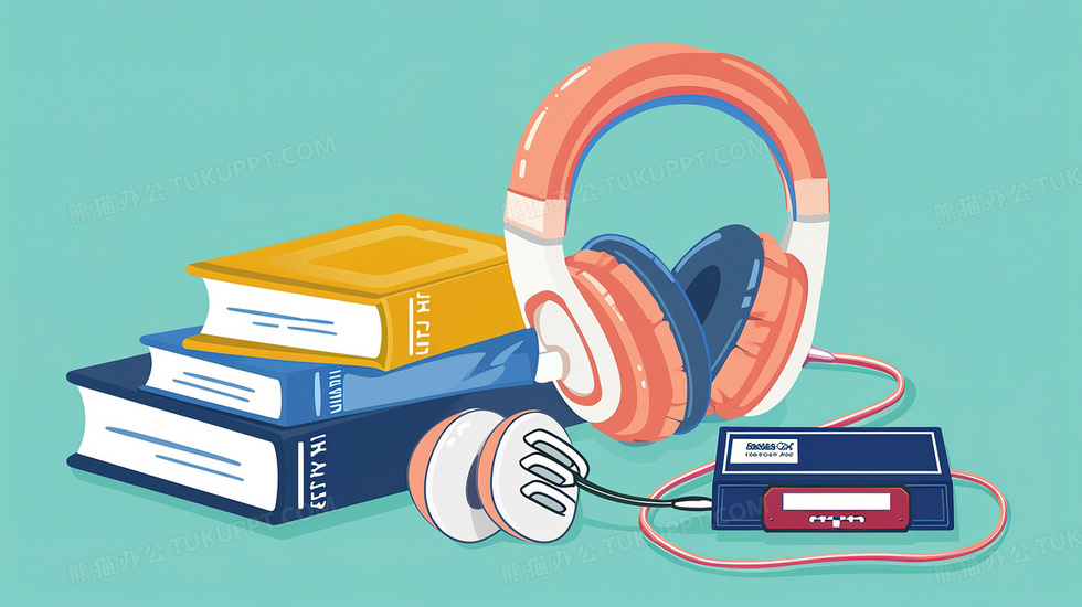 本作品内容为书本旁的摆放着的连着磁带的耳机插画, 格式为 jpg, 大小2 MB, 图片尺寸为2912 x 1632, 源文件无水印, 欢迎使用熊猫办公。 如认为平台内容涉嫌侵权,可通过邮件:tousu@tukuppt.com提出书面通知,我们将及时处理。