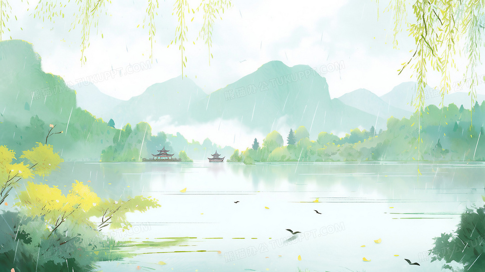本作品内容为雨水季下山间湖水边小船飘荡中国意境绿色背景插画, 格式为 jpg, 大小3 MB, 图片尺寸为2912 x 1632, 源文件无水印, 欢迎使用熊猫办公。 如认为平台内容涉嫌侵权,可通过邮件:tousu@tukuppt.com提出书面通知,我们将及时处理。