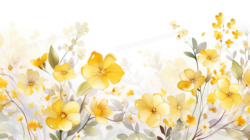 本作品内容为黄色花朵和灰绿色叶子装饰插画, 格式为 jpg, 大小2 MB, 图片尺寸为2912 x 1632, 源文件无水印, 欢迎使用熊猫办公。 如认为平台内容涉嫌侵权,可通过邮件:tousu@tukuppt.com提出书面通知,我们将及时处理。