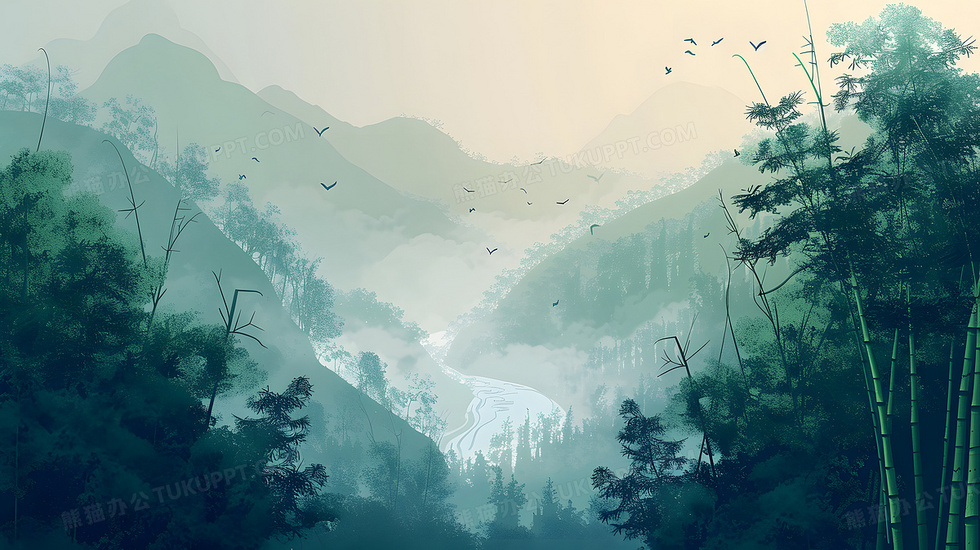 本作品内容为中国风山水竹林河流插画, 格式为 jpg, 大小11 MB, 图片尺寸为5824 x 3264, 源文件无水印, 欢迎使用熊猫办公。 如认为平台内容涉嫌侵权,可通过邮件:tousu@tukuppt.com提出书面通知,我们将及时处理。