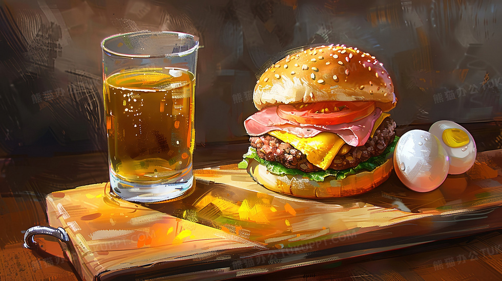 本作品内容为桌面美食快餐汉堡插画, 格式为 jpg, 大小3 MB, 图片尺寸为2912 x 1632, 源文件无水印, 欢迎使用熊猫办公。 如认为平台内容涉嫌侵权,可通过邮件:tousu@tukuppt.com提出书面通知,我们将及时处理。