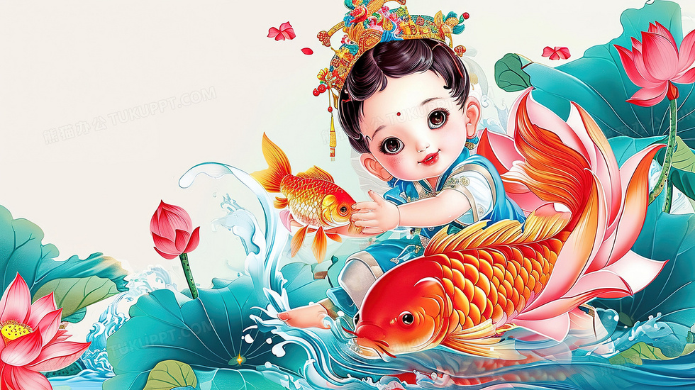 本作品内容为喜庆吉祥荷花锦鲤可爱的年画娃娃, 格式为 jpg, 大小4 MB, 图片尺寸为2912 x 1632, 源文件无水印, 欢迎使用熊猫办公。 如认为平台内容涉嫌侵权,可通过邮件:tousu@tukuppt.com提出书面通知,我们将及时处理。
