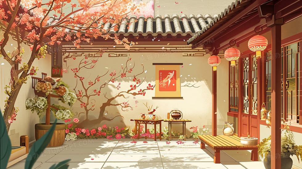 本作品内容为古建筑庭院春节装饰插画, 格式为 jpg, 大小4 MB, 图片尺寸为2912 x 1632, 源文件无水印, 欢迎使用熊猫办公。 如认为平台内容涉嫌侵权,可通过邮件:tousu@tukuppt.com提出书面通知,我们将及时处理。