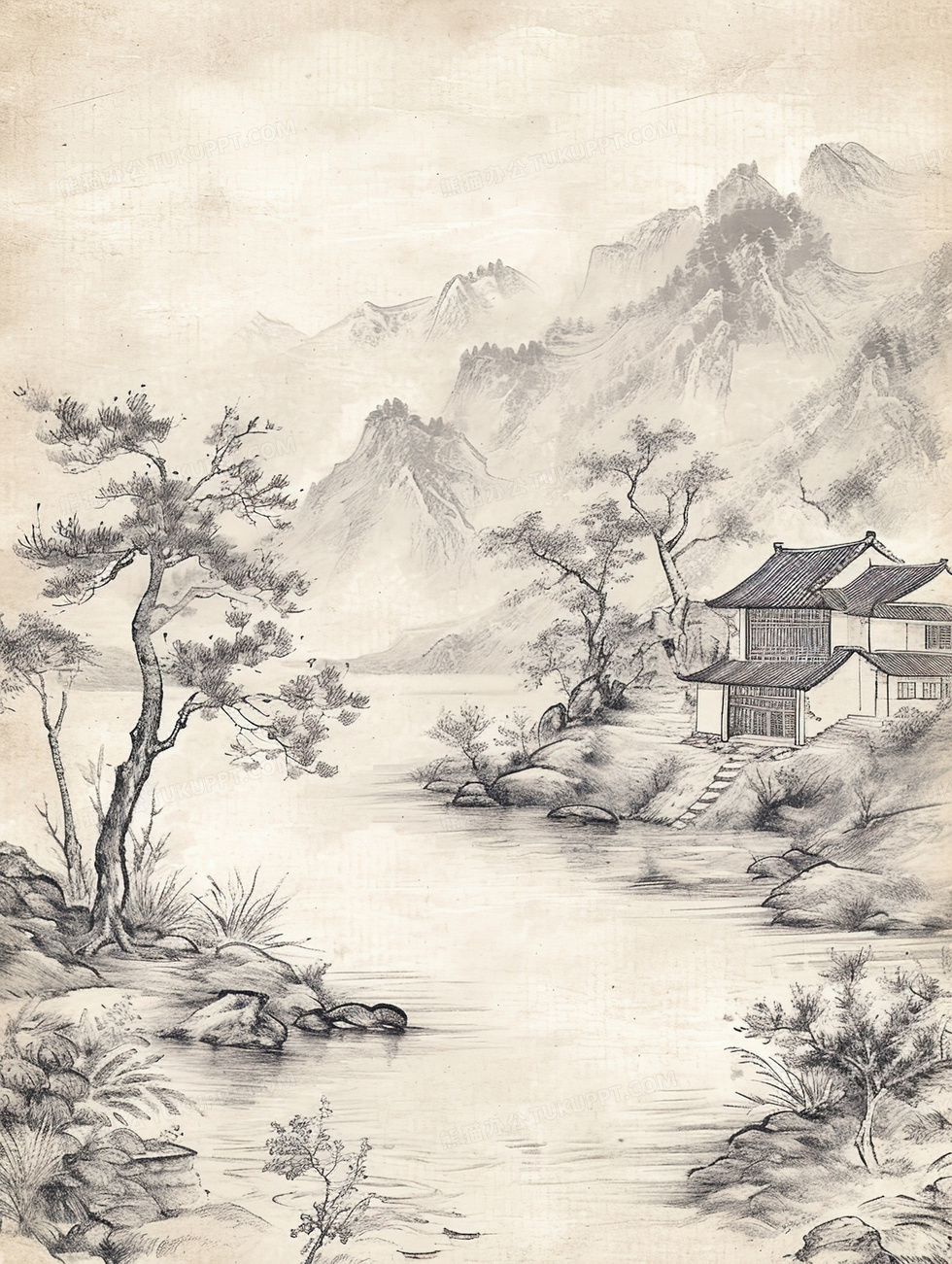 本作品内容为中国传统乡村山水插画, 格式为 jpg, 大小4 MB, 图片尺寸为1856 x 2464, 源文件无水印, 欢迎使用熊猫办公。 如认为平台内容涉嫌侵权,可通过邮件:tousu@tukuppt.com提出书面通知,我们将及时处理。