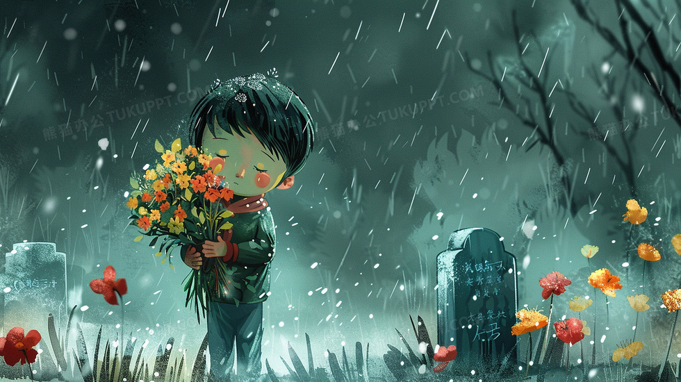 本作品内容为清明雨中抱着鲜花祭拜的男孩插画, 格式为 jpg, 大小4 MB, 图片尺寸为2912 x 1632, 源文件无水印, 欢迎使用熊猫办公。 如认为平台内容涉嫌侵权,可通过邮件:tousu@tukuppt.com提出书面通知,我们将及时处理。