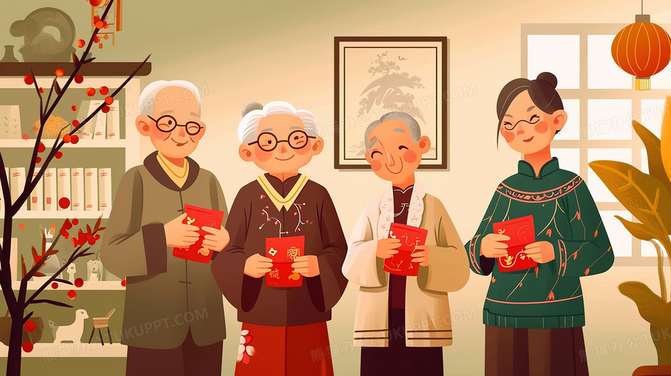 本作品内容为家里春节收到红包的老人们插画, 格式为 jpg, 大小2 MB, 图片尺寸为2912 x 1632, 源文件无水印, 欢迎使用熊猫办公。 如认为平台内容涉嫌侵权,可通过邮件:tousu@tukuppt.com提出书面通知,我们将及时处理。