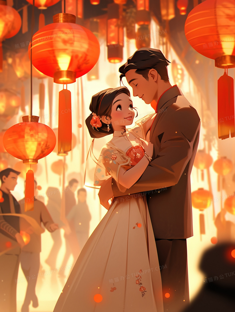 本作品内容为红灯笼下拥抱的情侣插画, 格式为 jpg, 大小2 MB, 图片尺寸为1856 x 2464, 源文件无水印, 欢迎使用熊猫办公。 如认为平台内容涉嫌侵权,可通过邮件:tousu@tukuppt.com提出书面通知,我们将及时处理。