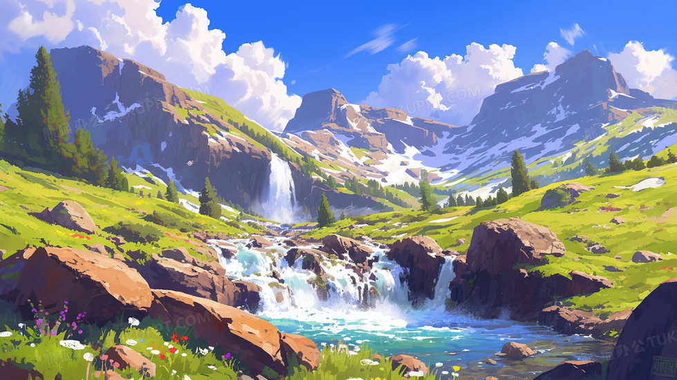 本作品内容为蓝天白云山水风景插画, 格式为 jpg, 大小4 MB, 图片尺寸为2912 x 1632, 源文件无水印, 欢迎使用熊猫办公。 如认为平台内容涉嫌侵权,可通过邮件:tousu@tukuppt.com提出书面通知,我们将及时处理。